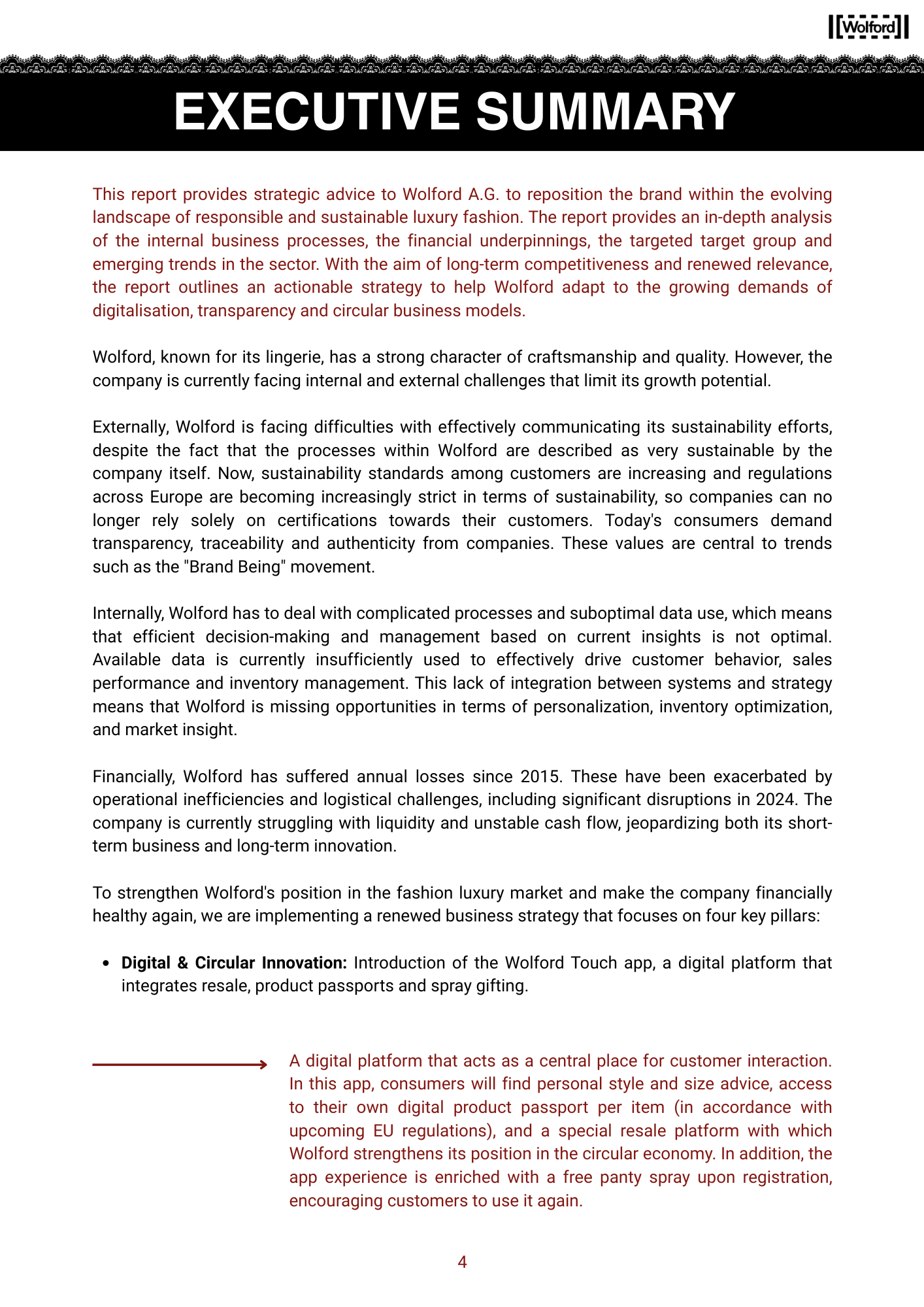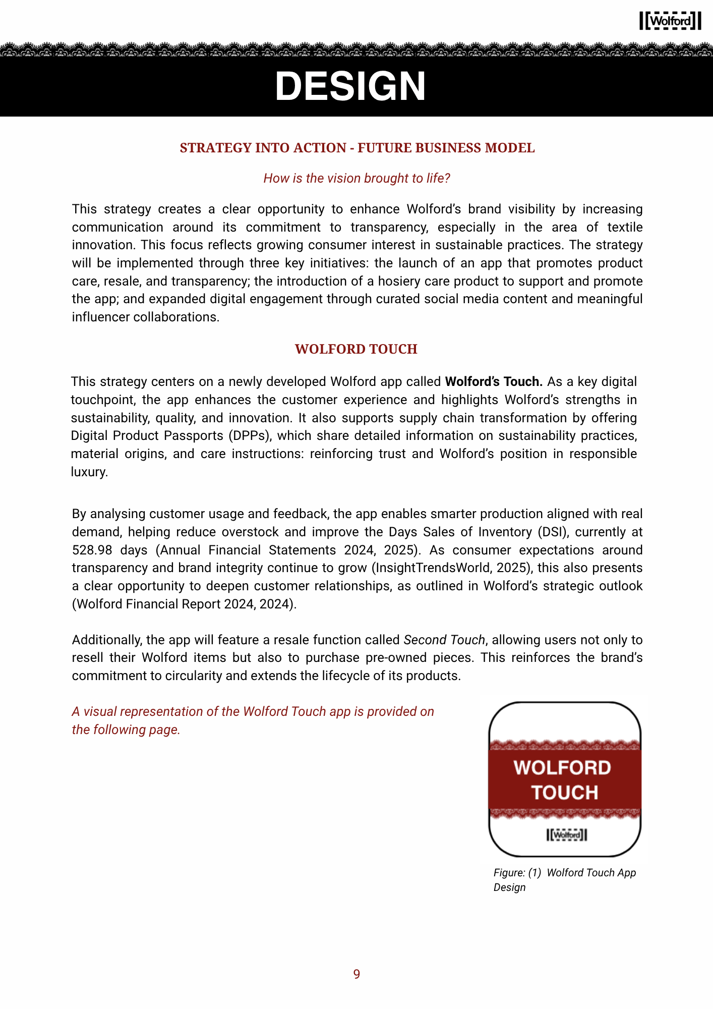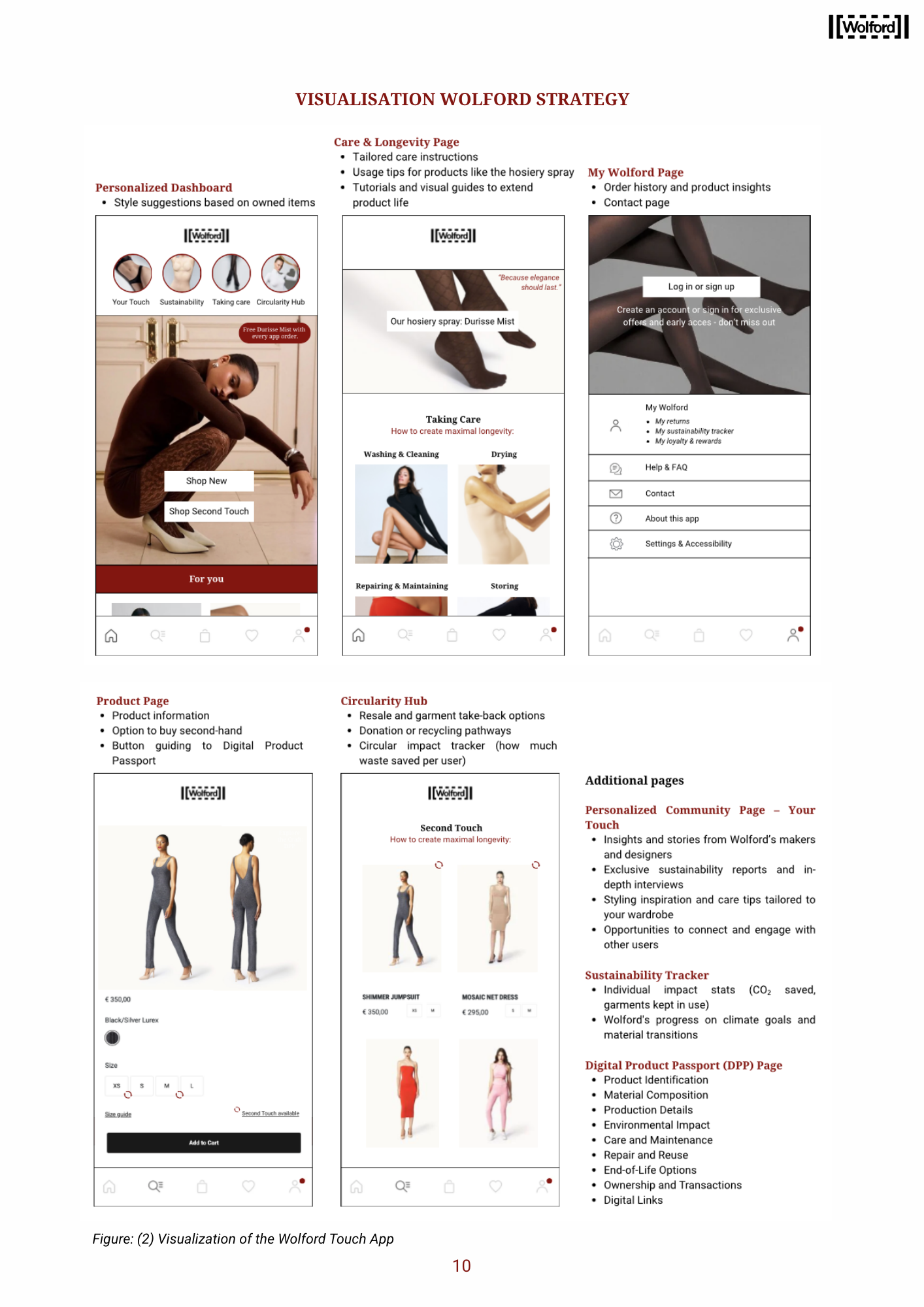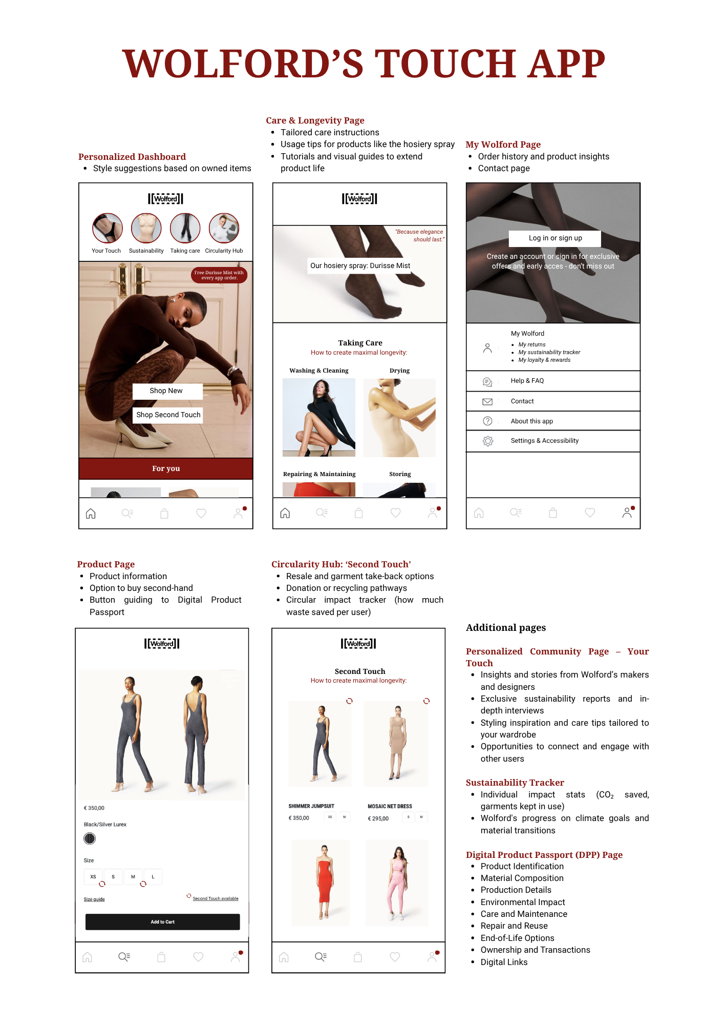 For Wolford, I developed a strategic concept as part of a hypothetical research project in which we acted as advisors to the brand. Together with my team, I created “Wolford Touch,” an app concept focused on care, resale, and transparency, featuring product care tutorials, a resale function, and Digital Product Passports. I contributed to shaping the concept, writing the strategic rationale, and visualising the app screens to show how a digital touchpoint can extend product life and strengthen customer relationships.